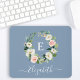 Modern elegant akvarell rosa blomsterkrans musmattor inkluderar rosa rosor, vita blommor och vacker botanisk grönska. Stoftig blå bakgrund. Personlig med din monogram initial och namn i ett stilrent typsnitt.