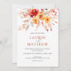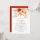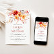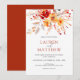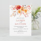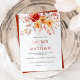 Denna eleganta akvarell-vildblomma höstbröllopsinbjudan har en livfull bukett av hösttonade akvarellvildblommor, blad och bär i solnedgångsfärger av djupa orange, persikor och taupe för att skapa en romantisk boho-elegans som kompletterar ditt stilrena höstbröllop. Den vackra varma paletten av handmålade blommor är perfekt parat med elegant serif-text för att kontrastera vackert mot den vita bakgrunden och skapa en naturlig men sofistikerad look. Perfekt för att styla din speciella dag med en elegant boho-höst charm.