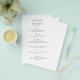 Elegantens svarta och vita bröllop-meny (tryckt på flygblad pappert) med en enkel och minimal design med en stor yta bakom namnen av bruden och trippen i ett traditionellt serif-teckensnitt. Ett klassiskt val som är perfekt för ett formellt bröllop.