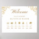 Welcome your guest with this elegant order of events, wedding timeline sign. Design with beautiful golden watercolor timeline images and delicate hand written calligraphy details. Clean and simple design full of elegance and grace. Ability to easily add on template your own times and text below images. If needed, you can edit this design using Zazzle's design tool and re-arrange the images to suit your own timeline needs. "IMPORTANT NOTE: This sign is in premium poster paper style, easy to frame or glue/staple to inexpensive MDF or foam board for display. If your prefer this sign prepared for display already in a foam board, please follow this easy steps: on this sign product page, scroll up, until you see a section with images called "Transfer design to a product". Use the arrow on the images to look at all the options, until you reach the "Foam Boards" option. Click on it, and it will transfer the design into a foam board for you. Initially sometimes it transfers the design into a very big foam board size, nevertheless you can change the sign into the size you need right there on the product page and even see how it looks already in a stand. When you add this design into your shopping cart, it will tell you the back side is in blank. Don't worry about it, as this only means that the back of the sign will be white.