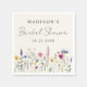 Eleganta blomsterbröllopsservetter med en nedre kant av akvarell vilda blommor och lövverk i nyanser av rosa, gul, lila, blå och grön på en krämfärgad bakgrund. Personalisera servetterna med brudens namn och datum. De personliga servetterna är perfekta för vår- och sommarbröllopsfester.
