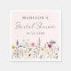 Eleganta blommiga bröllopsdusch servetter med en nedre kant av akvarell vilda blommor och lövverk i nyanser av rosa, gul, lila, blå och grön på en rosa bakgrund. Personalisera de vilda bröllopsdusch servetterna med den blivande brudens namn och datum. De personliga vilda servetterna är perfekta för vår- och sommarbröllopsdusch.