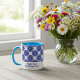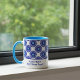 Den här chicen visar mugg de blå, onda, öga-charmerna som är arrangerade i en fantastisk geometrisk blommigt, kompletta med en anpassade text fält för ditt namn eller personliga beröring. Börja din dag med ett mysigt kaffe, ett stil-streck och ett uppsving för bra vibes. Om du vill ha speciella förfrågningar eller förfrågningar kan du kontakta konstnären på wafadahdalcreates@gmail.com. © Wafa Y. Dahdal - Med förbehåll för alla Höger. WD Art