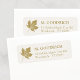 Mall för returadress av elegant med löv på den ömtåliga Cream White-bakgrunden med Guld Maple-. Adressetiketter med lyx. Observera att Guld-tonen simuleras i utskriften och inte är ett äkta metalliskt färg. Gör adressatomslag till en bris med © y.BEE PAPERIE