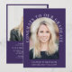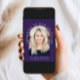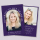 Elegant mörk lila studentfest-inbjudan med gradens foto i ett båge ram och "Gratulerar till Student" i vit serif-typografi och deras namn, skolår och klassår i enkel modern vit typografi. På baksidan lägger du till ytterligare ett foto och anpassar informationen om party.