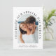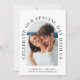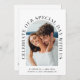 Modern bröllopsinbjudan med ditt foto i en bågformig ram omgiven av "fira vår Speciella dag med oss" i elegantens typografi. Under fotot lägger du till ditt första namn, bröllop-datum och plats. Anpassa din inbjudan i enkel typografi och ange adress på webbplatsen bröllop för att skapa en skannerbar QR-kod så att dina gäster kan söka efter OSA online och få ytterligare information om bröllop, t.ex. logi.