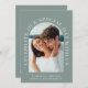 Modern grönt bröllopsinbjudan med ditt foto i en bågformig ram omgiven av "fira vår Speciella dag med oss" i elegantens vita typografi. Under fotot lägger du till ditt första namn, bröllop-datum och plats. Anpassa din inbjudan till enkel vit typografi på motsatt sida och ange webbadressen adress för bröllop för att skapa en skannerbar QR-kod så att dina gäster kan skanna till OSA online och få ytterligare information om bröllop, t.ex. logi och anvisningar.