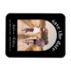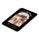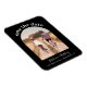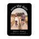 Minimal och elegant spara datum meddelande-magnet-keepé med ditt foto i ett bågat bild ram mot svart bakgrund. Anpassa "spara datumet" hälsning i enkel modern vit typografi, ditt namn i trendigets vita skript och ditt bröllop datum och plats.