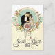Eleganta vintage Art Deco bröllop "Spara datum" med en romantisk, gammalmodig illustration av en vacker brud från Edvardian-tiden och en stilig brudgum från 1920-30-talet, omgivna av en söt, färgrik rund ram med blommor och sirliga slingor. Bruden bär en klassisk vit bröllopsklänning med lång, fladdrande slöja och en vacker bukett med rosa och blå blommor. Huvudfärgerna på "Spara datum"-korten är kräm, turkosblå, rosa och vit. Den snygga, sirliga, kursiva och sofistikerade texten "Spara datum" på framsidan är fast. Dessa söta, retro, fantasifulla, gammaldags, trendiga, fashionabla, glamorösa och klassiska vintage-inbjudningar till bröllop tackar ja är tryckta på båda sidor. All text kan enkelt anpassas efter dina behov och du kan ändra typsnitt, färg och storlek om du önskar. Om du behöver hjälp med att anpassa din produkt, kontakta mig via min butik så hjälper jag gärna till. Jag har matchande produkter i min butik.