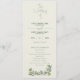 Guide your guests through your special day with this minimalist green floral wedding program card, featuring a clean ivory background, classic serif fonts, and soft sage typography for a timeless look. Delicate botanical blooms frame the bottom of both sides, adding a romantic garden touch that suits vineyard, countryside, and outdoor ceremonies. One side lists your wedding party, officiant, parents, attendants, flower girl, and ring bearer—alongside a heartfelt thank-you message, while the reverse outlines the full order of ceremony so guests can follow each moment with ease. Fully customizable text allows you to personalize names, roles, date, venue, and wording, creating a coordinated keepsake that complements the rest of your green botanical wedding stationery.