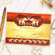 RSVP-kort för matchande inbjudningar med två vita elefanter i kärlek, uppmuntrade av sina familjer och stam. Bakgrunden är en stilren kombination av ocker och burgunder med metalliska element. Det är också möjligt att ta bort bilden på baksidan och använda antingen din egen bild eller välja en anpassad färg. Denna design är inspirerad av indisk konst.