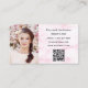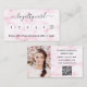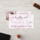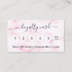 rosa marmor som bakgrund, svart text På framsidan: Lägg till rabatt. Tillbaka: Anpassa och lägg till foton, namn, titel, mobilt nummer, e-post, webbplatsadress, qr-kod på webbplatsen. Lila brev. Utan glitter på baksidan.