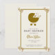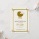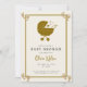 Den här designen har en minimalistisk och elegant babyduschinbjudan med en guld-tonad vagnslanillustration i baby vid dess centrum. Layouten ramas med en varm beige bakgrund och accentueras av vackra fotavtryck från baby i hörnen. I texten framhävs namn för firman i ett snyggt-skript, parat med ren typografi för händelseinformationen, skapar det perfekten för att fira en ny ankomst med klass och charm.