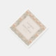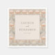 This elegant wedding napkin design features a central rectangular frame with customizable names and date, surrounded by a symmetrical pattern of soft pastel floral motifs in peach, light blue, and cream. The intricate Art Nouveau-inspired elements create a harmonious border that adds sophistication to the overall layout. With clean lines and smooth color transitions, this digital illustration offers a timeless aesthetic perfect for formal celebrations. The classic serif typography ensures readability while enhancing the refined mood, making it an ideal choice for couples looking to add a touch of elegance to their special day.