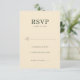 This elegant RSVP card features a minimalist design with a soft beige background, creating a refined and inviting atmosphere. The layout is clean and vertically oriented, with bold serif typography for the "RSVP" header and a cursive script placeholder for personalization. Two simple options for acceptance or decline are presented in a contrasting sans-serif font, ensuring clarity and ease of use. Perfect for formal events, this card combines sophistication with functionality, making it an ideal choice for weddings or upscale gatherings.