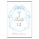 Ett sött blått band och rulle omger ditt eleganta bekräftelsebordsnummer för din lilla pojke. Ett vackert kristet kors är ovanför detaljerna för ditt döpta barn. Vacker religiös dekoration för din katolska dop eller bekräftelseceremoni.