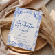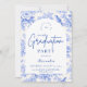 En elegant examensfirande design med en delikat blå toile blommig kant inspirerad av klassiskt europeiskt porslin och vintage botaniska tryck. De invecklade blommorna ramar in en ren välvd mittpanel och skapar en förfinad och tidlös komposition som framhäver examenens namn och evenemangsinformation på ett vackert sätt. Mjuka blå toner mot en skarp elfenbensvit bakgrund ger designen en sofistikerad men firande känsla. Perfekt för en stilfull examensfest med en klassisk, romantisk estetik.