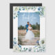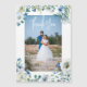 Glada vita pionblommor och gröna akvarellblad bildar en vacker ram runt det gifta parets foto på detta vackra blå blomster vårbröllop tack-magnetkort. Chic, modern handskriven skrift är i vit överläggning på er nygifta fotografiska magnet.