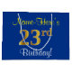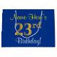 Den här enkla presentsäcksdesignen i eleganten innehåller ett personlig som "Namn-här's 23:e födelsedagen!" (med "23:e" som har ett utseende som liknar guld i utseende) på en blå färgad. Namn är i skriptliknande gult-färgad och kan anpassas. En sådan här personlig-födelsedagspressning skulle kanske kunna användas när en present eller gåva till någon som firar sin tjugotredje födelsedag är ge. [~Z0000260]