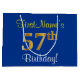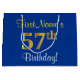 Den här enkla presentsäcksdesignen i eleganten innehåller ett personlig som "FirstName's 57:e födelsedagen!" (med "57:e" som har ett utseende som liknar guld- och faux-/imitationsfärgen) på en blå färgad. Namn är i skriptliknande gult-färgad och kan anpassas. En sådan här personlig-födelsedagspressning skulle kanske kunna användas när en present eller gåva till någon som firar sin femtiosjunde födelsedag är ge. [~Z0000260]