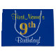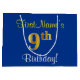 Den här enkla presentsäcksdesignen i eleganten innehåller ett personlig som "FirstName's 9th Birthday!" (med "9th" som har ett utseende som liknar guld i utseende) på en blå färgad. Namn är i skriptliknande gult-färgad och kan vara personlig. En sådan här personlig-födelsedagspressepåse kan kanske användas när en present eller gåva till någon som firar sin nionde födelsedag är ge. [~Z0000260]