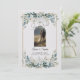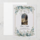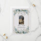 Sätt tonen för din speciella dag med denna eleganta blå grönska Spara datum-inbjudan. Med mjuka akvarellblommor i dammig blå och salvia grön färg kombinerar denna design elegant elegans med naturlig charm. En delikat guld dubbel linje ram inramar layouten, medan frodiga blomkluster vid toppen och botten lägger till balans och skönhet utan att överväldiga ditt personliga meddelande.