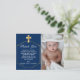 Tacka vänner och familj för att de deltog i din lilla pojkes dop genom att skicka dem detta eleganta dopkort med mörkblå guld kors tackkort för pojkar. Detta dop tack för en pojke har ett vackert gyllene kors med en gyllene ram mot en enkel och elegant mörkblå bakgrund. Anpassa texten och teckensnittet efter eget tycke, vilket inkluderar ditt barns namn, en personlig anteckning, din signatur och din returadress på baksidan av vykortet. Lägg till ett speciellt foto av din bebis för en extra speciell touch.