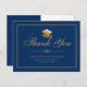 Skicka ett elegant examensbevis tack-kort till din familj och vänner för att tacka dem för deras stöd med en illustration av en examensmössa på framsidan med ett falskt guldklassiskt skrivsätt på en blå bakgrund som lyder. "Tack" med ditt namn, skola och klass/år nedan för att anpassa det med en guldförgylld avdelare. Baksidan av vykortet har ett anpassat meddelande och signatur. Designad av ©Susan Coffey.