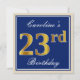 Denna enkla och eleganta födelsedagsinbjudan har ett personligt meddelande som "Carolines 23-årsdag" (med "23" i en imitation av guldliknande färg) inom ett blått kvadratiskt område med en enkel ram. Namnet är skrivet med ett elegant, vitt, script-liknande typsnitt och kan anpassas. Baksidan har anpassningsbara detaljer om inbjudan. En födelsedagsinbjudan som denna kan användas när man bjuder in folk till en födelsedagsfest för någon som fyller 23 år.