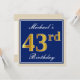Denna enkla och eleganta födelsedagsinbjudan har ett personligt meddelande som "Michaels 43-årsdag" (med "43" i en imitation av guldliknande färg) inom ett blått kvadratiskt område med en enkel ram. Namnet är skrivet med ett elegant, vitt, script-liknande typsnitt och kan anpassas. Baksidan har anpassningsbara detaljer om inbjudan. En födelsedagsinbjudan som denna kan användas när man bjuder in folk till en födelsedagsfest för någon som fyller 43 år.