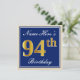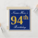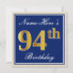 Denna enkla och eleganta födelsedagsinbjudan design har ett personligt meddelande som "Namn-Här är 94-årsdagen" (med "94" i en imitation av guldliknande färg) inom ett blått kvadratiskt område med en enkel ram. Namnet är i en elegant vit, scriptliknande text och kan anpassas. Baksidan har personliga detaljer om inbjudan. En födelsedagsinbjudan som denna skulle kunna användas när man bjuder in människor till en födelsedagsfest som hålls för någon som firar sin nittiofjärde födelsedag.