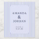 Dessa eleganta vinetiketter för bröllop har en minimalistisk design med vertikala ränder i mjuka pastellblå och vita nyanser som skapar en lugn och sofistikerad atmosfär. Den centrerade rektangulära ramen framhäver namnen "Amanda & Jordan" i fet serif-typografi, kompletterad med mindre sans-serif-text för plats- och datumdetaljer. Den rena layouten och moderna stilen gör dessa etiketter perfekta för att fira din speciella dag med en touch av underdriven elegans. Idealiska för bröllop eller romantiska evenemang, erbjuder de anpassningsbara alternativ för att enkelt anpassa din fest.