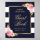 Denna eleganta blå och vita randiga blommiga skylt inbjuder bröllopsgästerna att skriva i er gästbok. Matchande föremål finns tillgängliga för att komplettera denna bröllopsgästbokssignering med akvarell rosa blommor och förgylld grönska.