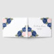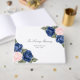 Elegant minnesgästbok med blommor inspirerad av blå och rosa rosor och babysand på en ren vit bakgrund.