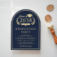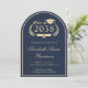 Formell och klassisk bågformad mörkblå universitets-examensinbjudan med "Årskull" inom en guldbelagd lagerkrans som innehåller en examenshatt och diplom, och examenens namn i elegant ljusguldskrift. Lägg till deras skola, huvudämne, hedersbetygelser eller framtida planer och examensfestens detaljer i modern guldbokstav.