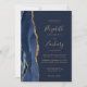 Den moderna bröllopsinbjudan från elegantens lämnat kant har en marin blå vattenfärgsagat gräns som trimmas med faux guld glitter. Anpassadet kombinerar handskrift, rityta och kursivt typsnitt med guld färgad mot en marin blå bakgrund. Den omvända sidan har en matchande marin blå och guld-agate-design.