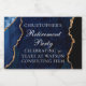 Elegant marinblått och guld agate dekorerar båda sidor av detta moderna pension-parti. Chic och snyggt mini-champagne flaska för en pensionär som vänner och familj firar i slutet av sin karriär.