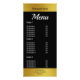 Framtill: I överkanten har det här rackkortet för elegant en svart visning för restaurangens namn på ett faux guld rand. Under den texten står det "Meny" i den vita texten. Under Meny finns det vit text för menyalternativ och priser. Faux guld rand vid grund har svart visning för adress och mobilt nummer. Tillbaka: Det finns ytterligare vit text för menyalternativ och priser. All text kan redigeras eller tas bort. Guld är en konstnärlig återgivning (inte folie).