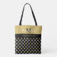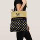 Personalized tote bag with a gold geometric diamond and white circle dot pattern. The top section of the design is metallic gold with the name and monogram. The middle section is solid black with gold customizable text.