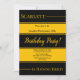 Den här eleganten svart och guld födelsedag är perfekt för en modern födelsedag. Den enkla designen har en svart bakgrund och kalligrafi i guld på en svart och guld strimlad bakgrund.