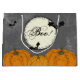 En Halloween-presentsäck med en vintage-inspirerad design med pumpor, fladdermus och ett glödande måne med ord Boo! — perfekt för förpackning av Halloween fest-varor, godis eller säsong-gåvor.