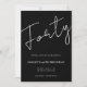 A chic, modern 40th birthday invitation with a deep black background and a bold handwritten “Forty” script centerpiece, finished with clean minimalist typography underneath. Perfect for an upscale milestone celebration—cocktail party, dinner, or evening soirée—this design keeps the focus on the statement headline while your event details stay clear and easy to read. Personalize the name, date, time, and location to match your plans.