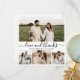 Elegant Black and White "Kärlek and tack"-skript 4 Photo Collage Bröllop - tackkort. Snyggt, modern, minimalistisk bröllop-tack för att du har en kortmall med fyra (4) foto på framsidan och ett foto på baksidan. Med texten "Kärlek och tack" i ett snabbt och välskrivet typsnitt för typografi swash-svan i svart på vit färg-bakgrund. Anpassa det anpassade namnet och tack för meddelandet. Om du föredrar att skicka anteckningen tar du bort exempeltexten för att få mer utrymme. Om du behöver hjälp eller matchande objekt kan du kontakta designern.