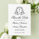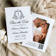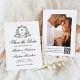 Meddela din speciella dag i stil med det här fotokortet för elegant, bröllop spara datum, med en vapensköld för svart blommigt som sätter parets monogram initialer. "Spara datumet" är skrivet i grå svart kalligrafi på en skarp vit bakgrund, med utrymme för att anpassa namn, datum och plats för bröllop. I baksidan visas fotot på lodräts förlovning och en bekväm QR-kod, vilket gör att gästerna enkelt kan komma åt bröllop webbplats. Lägg till instruktioner för anpassningsbarna och information om bröllop för att slutföra sökningen. Perfekt för svartvita bröllop-teman eller modernt och formellt firande, det här anpassadet sparar datumkortet och ger dig tidlös sofistikering till ditt bröllop-kontor.