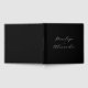 This elegant wedding guest book features a sophisticated design with the names "Penelope and Alexander" in a luxurious metallic gold script font on a solid black background. The minimalist layout emphasizes the importance of the names, creating a formal and celebratory atmosphere perfect for weddings or significant announcements. The clean composition and use of negative space highlight the refined style, making it an ideal keepsake for capturing well-wishes from loved ones.
