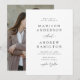 Inbjudan till elegant bröllop som innehåller uppgifter om namn och bröllop i svart skrift med vit bakgrund. Ett modernt kalligrafiskt skript kompletterar det här mångsidiga svarta och vita bröllopsinbjudan. Inbjudan går tillbaka till visningen av ditt favoritfoto på förlovningen. Den här enkla inbjudan till fotobröllop är perfekt för både formell och avslappnad bröllop av vilken säsong som helst.