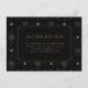 This elegant wedding enclosure card features a sophisticated black background adorned with gold celestial motifs, including stylized suns and stars arranged in a symmetrical grid pattern. The central panel showcases clean serif typography in a matching gold hue, highlighting the heading "ALL THE DETAILS" followed by customizable text directing guests to a wedding website for more information. The design exudes a vintage charm with its cosmic theme, creating an atmosphere of formality and anticipation perfect for special occasions like weddings.
