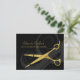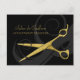 Elegant svarta och guld hårsalon möte påminnelsekort med ett par faux guld-sax som sitter i en mjuk silhuett av vackra gardiner. Anpassa genom att ange professionellens hårstylist- eller hårfrisörsinformation och kontaktinformation. Underbar för kunder som saknar dina kort. Platt tryckt bild, INTE guld metallisk.