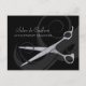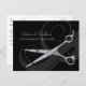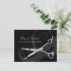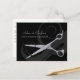 Elegant svarta och silver hårsalon möte påminnelsekort med ett par faux silver-sax som sitter i en mjuk silhuett av vackra gardiner. Anpassa genom att ange professionellens hårstylist- eller hårfrisörsinformation och kontaktinformation. Underbar för kunder som saknar dina kort. Platt tryckt bild, INTE silver metallisk.