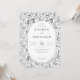 This elegant wedding invitation features a sophisticated monochromatic floral pattern with intricate botanical illustrations framing the central text. The design showcases a classic and timeless style, enhanced by clean lines and precise detailing in black against a crisp white background. The typography combines bold serif fonts for the names with lighter weights for additional details, creating a balanced and formal layout. Perfect for conveying sophistication and celebration, this invitation is ideal for couples seeking a refined and nature-inspired aesthetic for their special day.